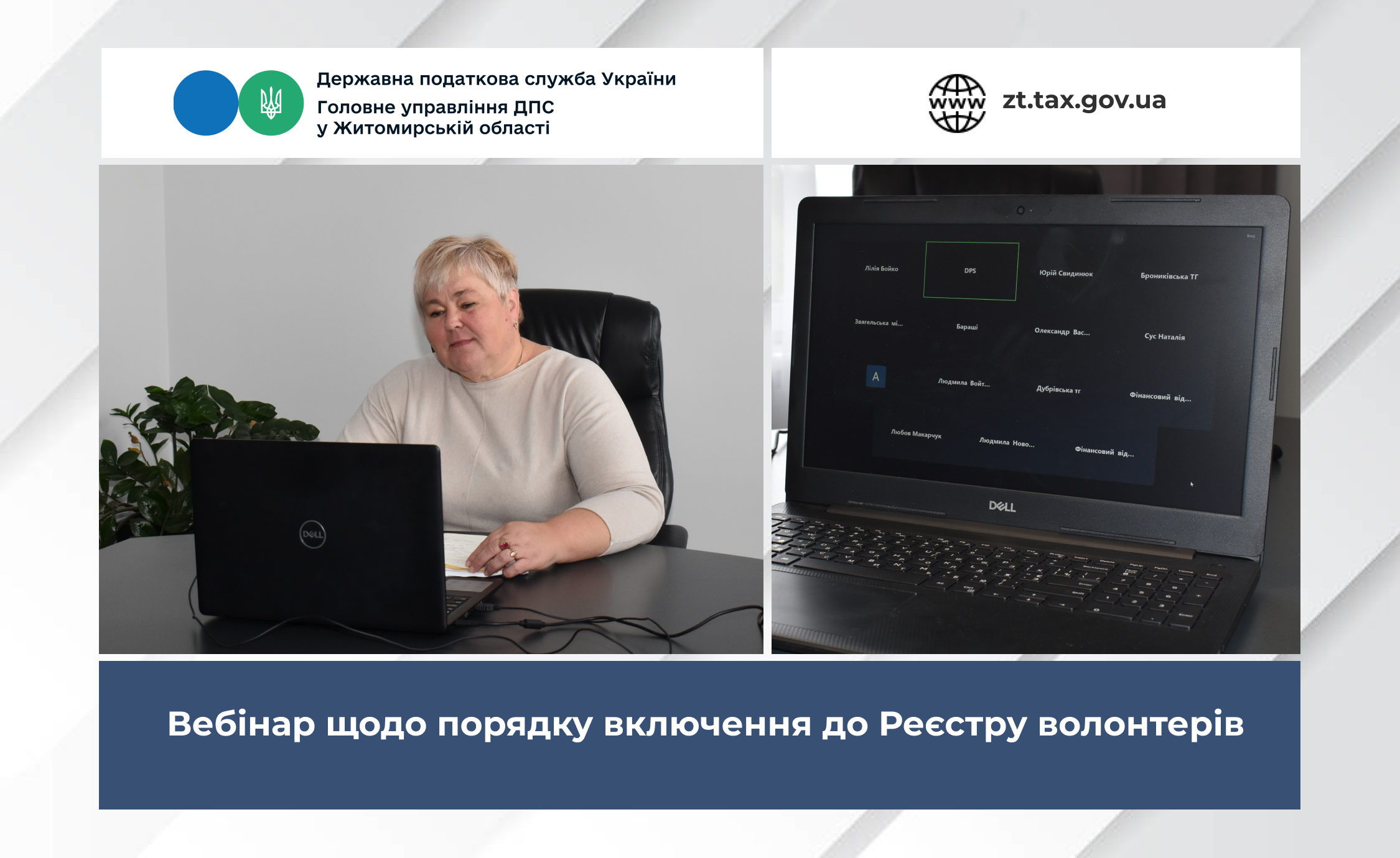 Сьогодні в Головному управлінні ДПС у Житомирській області відбувся онлайн-вебінар, присвячений актуальній темі — реєстрації волонтерів та волонтерських організацій.