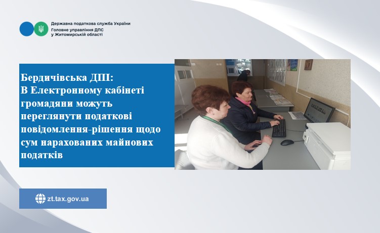 Працівники Бердичівської ДПІ звертають увагу відвідувачів ЦОП, що Електронний кабінет залишається одним з найпопулярніших сервісів Державної податкової служби України. Це найбільш зручний та ефективний спосіб взаємодії платників податків з податковими органами. В окремому меню Електронного кабінету «ЕК для громадян» об’єднано сервіси для фізичних осіб. В «ЕК для громадян» громадяни отримують доступ до наступної інформації: