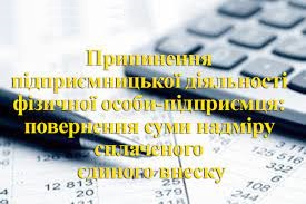 Таким чином, фізична особа – підприємець, у разі державної реєстрації припинення підприємницької діяльності, має можливість повернути суму надміру сплаченого єдиного внеску на підставі заяви, яка подається до дати зняття з обліку такого платника.