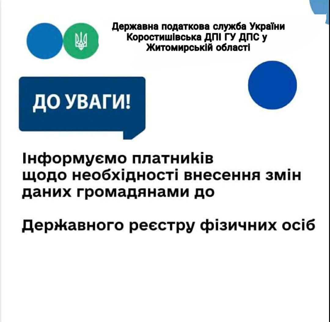Коростишівська ДПІ Головного управління ДПС у Житомирській області інформує, що відповідно до п. 70.7 ст. 70 Податкового Кодексу України, фізичні особи – платники податків зобов’язані подавати контролюючим органам відомості про зміну даних, які вносяться до облікової картки протягом місяця з дня виникнення таких змін шляхом подання відповідної заяви за формою та у порядку, визначеними центральним органом виконавчої влади, що забезпечує формування та реалізує державну фінансову політику.