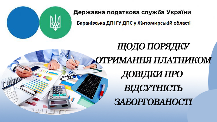 Баранівська ДПІ ГУ ДПС у Житомирській області нагадує, що Довідка про відсутність заборгованості з платежів, контроль за справлянням яких покладено на контролюючі органи (далі – Довідка), надається відповідно до Наказу Міністерства фінансів України від 03.09.2018 № 733, зареєстрованого в Міністерстві юстиції України 27.09.2018 за № 1102/32554, яким затверджено Порядок надання довідки про відсутність заборгованості з платежів, контроль за справлянням яких покладено на контролюючі органи (далі – Порядок № 733).