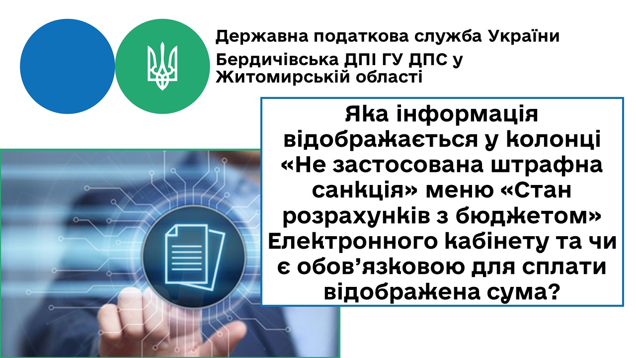 - Бердичівська ДПІ: «Не застосована штрафна санкція (передбачена відповідно до норм ПКУ)» меню «Стан розрахунків з бюджетом» Електронного кабінету
