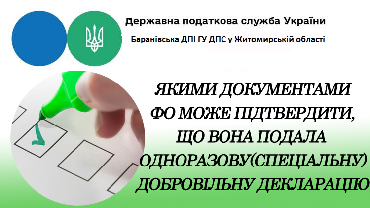 Баранівська ДПІ ГУ ДПС у Житомирській області повідомляє, що відповідно до п. 1 підрозд. 9 прим. 4 розд. ХХ Податкового кодексу України від 02 грудня 2010 року № 2755-VI зі змінами та доповненнями (далі – ПКУ) одноразове (спеціальне) добровільне декларування – це особливий порядок добровільного декларування фізичною особою, визначеною п. 3 підрозд. 9 прим. 4 розд. ХХ ПКУ, належних їй активів, розміщених на території України та/або за її межами, якщо такі активи фізичної особи були одержані (набуті) такою фізичною особою за рахунок доходів, що підлягали в момент їх нарахування (отримання) оподаткуванню в Україні та з яких не були сплачені або сплачені не в повному обсязі податки і збори відповідно до вимог законодавства з питань оподаткування та/або міжнародних договорів, згода на обов’язковість яких надана Верховною Радою України, та/або які не були задекларовані в порушення податкового та валютного законодавства, контроль за дотриманням якого покладено на контролюючі органи, протягом будь-якого з податкових періодів, що мали місце до 1 січня 2021 року.