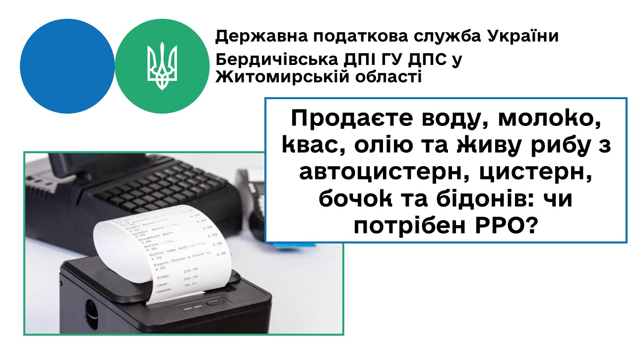 Бердичівська ДПІ: Про застосування РРО/ПРРО при продажу води, молока, квасу, олії та живої риби з автоцистерн, цистерн, бочок та бідонів