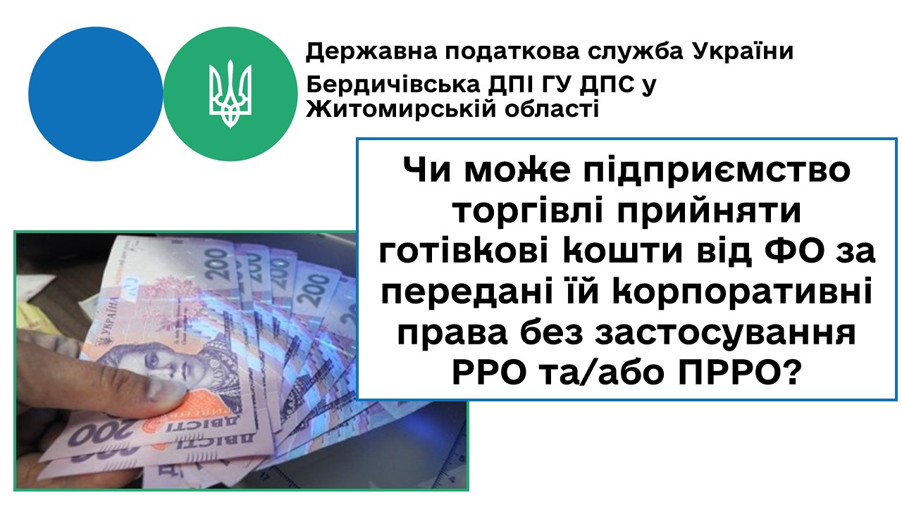 Отже, підприємство торгівлі, при отриманні від фізичної особи готівкових коштів за передані їй корпоративні права, має здійснювати такі операції із застосуванням РРО та/або ПРРО або проводити розрахунки у безготівковій формі через установи банків.