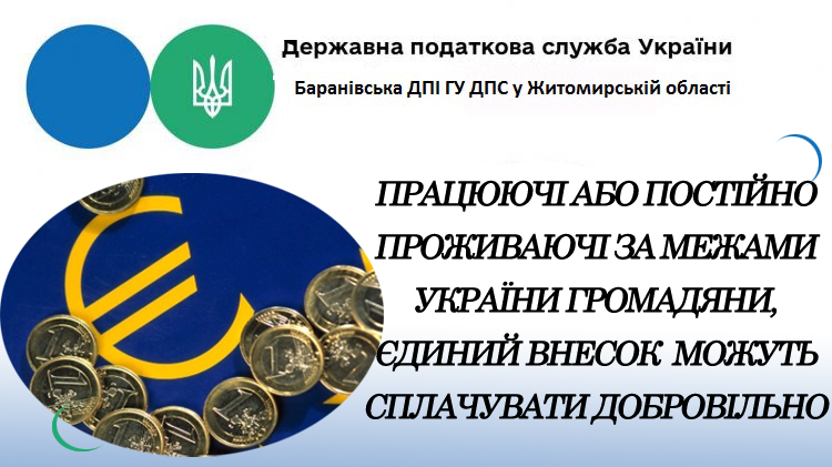 У Баранівській ДПІ ГУ ДПС у Житомирській області інформує, що громадяни України, які працюють або постійно проживають за межами України, мають право на добровільну сплату єдиного внеску на загальнообов’язкове державне соціальне страхування (далі - ЄВ) на загальнообов’язкове державне пенсійне страхування (ст. 10 Закону України №2464 «Про збір та облік єдиного внеску на загальнообов’язкове державне соціальне страхування»).