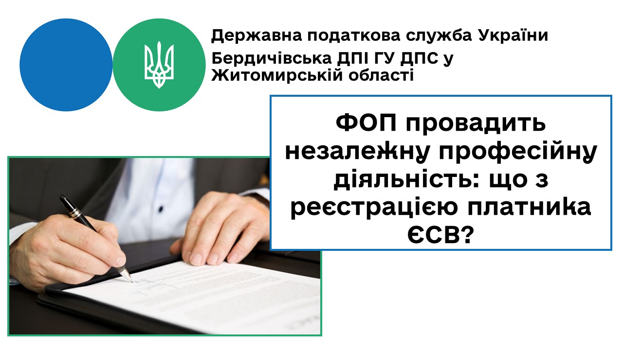 Бердичівська ДПІ інформує, що згідно ст. 4 Закону України № 2464-VI «Про збір та облік єдиного внеску на загальнообов’язкове державне соціальне страхування» платниками єдиного внеску на загальнообов’язкове державне соціальне страхування (далі - ЄВ), є, зокрема, ФОП та особи, які провадять незалежну професійну діяльність. Взяття на облік в контролюючих органах самозайнятих осіб здійснюється відповідно до розд. ІІІ Порядку обліку платників єдиного внеску на загальнообов’язкове державне соціальне страхування, затвердженого наказом Міністерства фінансів України від 24.11.2014 №1162.