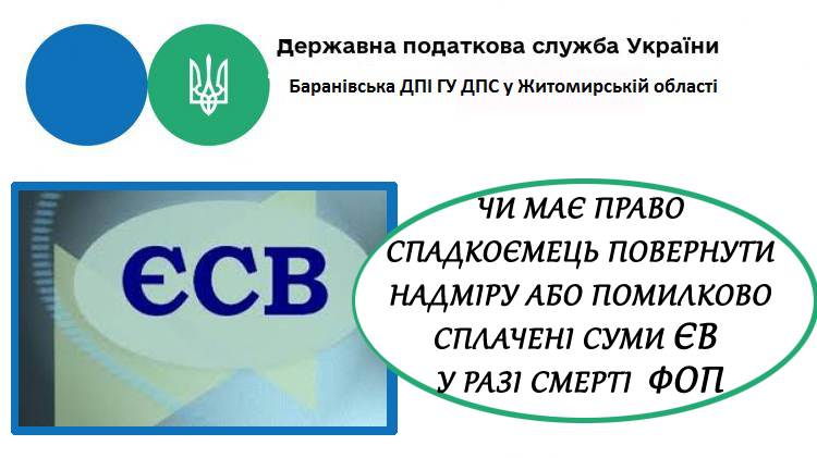 Отже, у разі смерті ФОП – платника ЄВ його спадкоємець не має право на повернення надміру або помилково сплачених сум ЄВ, оскільки у розумінні Закону № 2464 спадкоємець не є платником ЄВ і на нього не розповсюджуються права та обов’язки платника.