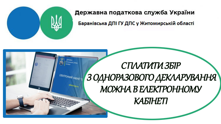 Баранівська ДПІ ГУ ДПС у Житомирській області інформує, що після подання громадянином одноразової (спеціальної) добровільної декларації автоматично відкривається інтегрована картка платника за відповідною територією та в приватній частині Електронного кабінету в розділі «Стан розрахунків з бюджетом» стає доступна інформація з відображенням реквізитів для сплати задекларованих сум збору з одноразового (спеціального) добровільного декларування з можливим використанням однієї із наявних платіжних систем або згенерованого QR-коду за кодом платежу 11011100.
