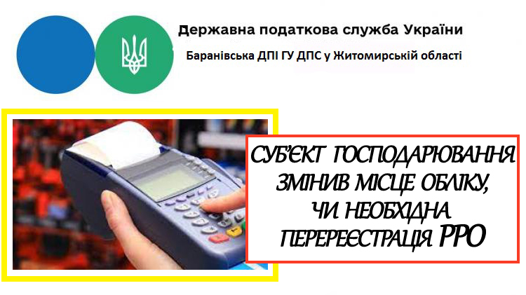 Баранівська ДПІ ГУ ДПС у Житомирській області повідомляє, що відповідно до пункту 4 глави 3 розділу II Порядку реєстрації та застосування реєстраторів розрахункових операцій, що застосовуються для реєстрації розрахункових операцій за товари (послуги), затвердженого наказом Мінфіну від 14.06.2016 р. № 547 (далі – Порядок) встановлено, що у разі зміни місцезнаходження або місця проживання, включення/невключення суб’єкта господарювання до Реєстру великих платників податків, реорганізації контролюючих органів чи з інших причин, унаслідок яких змінюється контролюючий орган, в якому суб’єкт господарювання обліковується як платник податків за основним місцем обліку, протягом двох робочих днів після переведення платника податків на обслуговування до контролюючого органу за новим місцем обліку засобами інформаційно-телекомунікаційної системи ДПС здійснюється перереєстрація РРО до контролюючого органу за новим основним місцем обліку суб’єкта господарювання як платника податків.