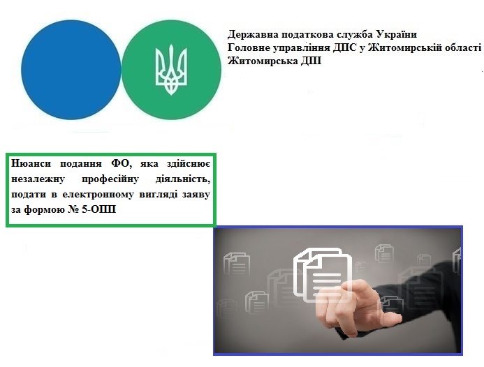 У Житомирській ДПІ ГУ ДПС у Житомирській області інформують, як фізичній особі, яка здійснює незалежну професійну діяльність подати в електронному вигляді заяву за формою № 5-ОПП з копіями документів, що підтверджують право ФО на провадження незалежної професійної діяльності.