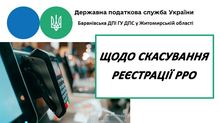 Баранівська ДПІ ГУ ДПС у Житомирській області повідомляє,що відповідно до п. 1 глави 4 розд. II Порядку реєстрації та застосування реєстраторів розрахункових операцій, що застосовуються для реєстрації розрахункових операцій за товари (послуги), затвердженого наказом Міністерства фінансів України від 14.06.2016 № 547 із змінами та доповненнями (далі – Порядок № 547), реєстрація реєстратора розрахункових операцій (РРО) діє до дати скасування реєстрації РРО, що відбувається у випадках, коли: