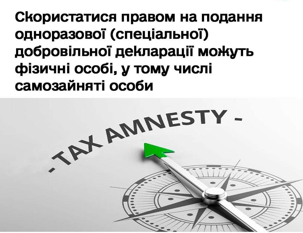 Чуднівська ДПІ ГУ ДПС у Житомирській області повідомляє, у разі якщо самозайнята особа має у власності кошти, отримані нею від здійснення господарської діяльності, але такі кошти не були задекларовані у податковій декларації, а також не були сплачені податки, встановлені податковим законодавством, то така особа має право задекларувати вказані кошти шляхом подання одноразової (спеціальної) добровільної декларації та сплатити збір з одноразового (спеціального) добровільного декларування.