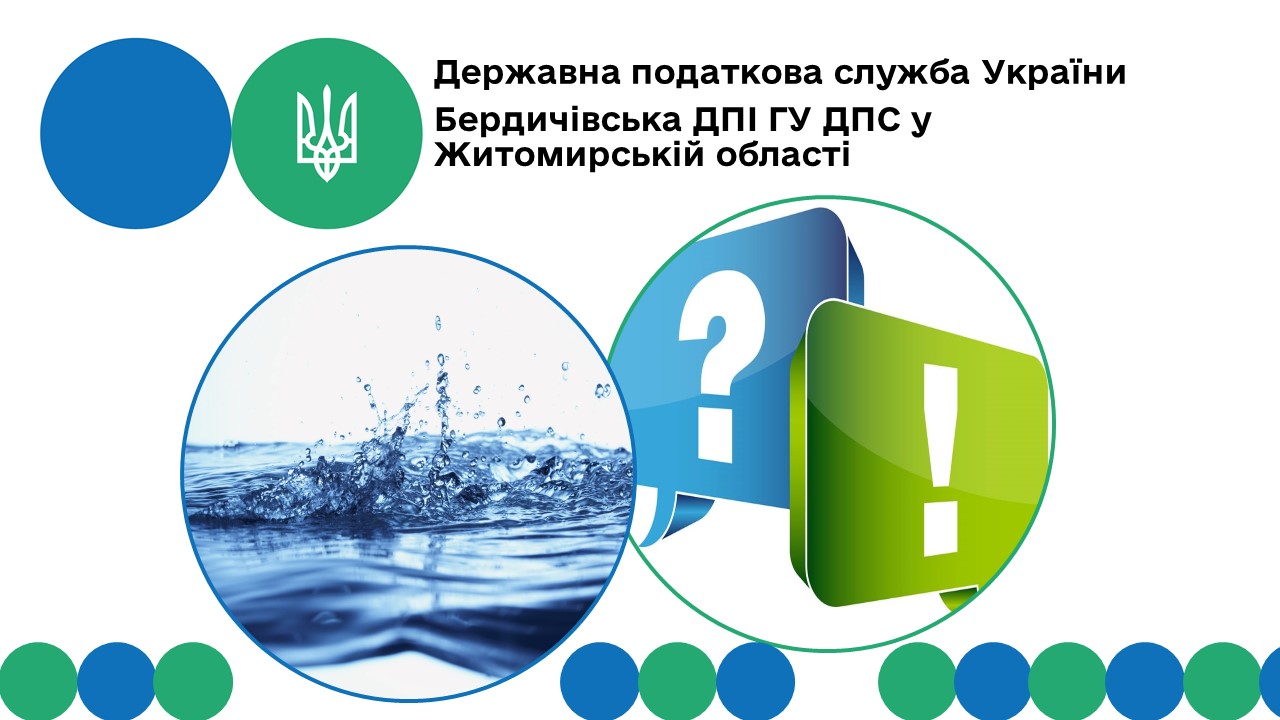 Бердичівська ДПІ інформує, що відповідно до п. 255.1 ст. 255 Податкового кодексу України від 02 грудня 2010 року № 2755-VI зі змінами та доповненнями (далі – ПКУ) платниками рентної плати за спеціальне використання води (далі – рентна плата) є, зокрема, первинні водокористувачі – суб’єкти господарювання незалежно від форми власності: юридичні особи, їх філії, відділення, представництва, інші відокремлені підрозділи без утворення юридичної особи, постійні представництва нерезидентів, а також фізичні особи - підприємці, які використовують та/або передають вторинним водокористувачам воду, отриману шляхом забору води з водних об’єктів.