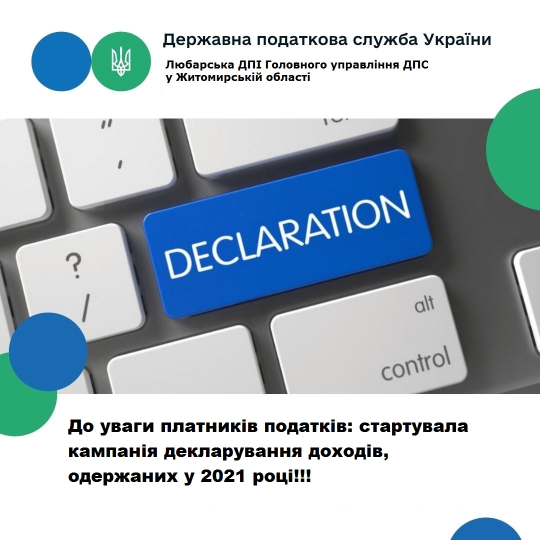 Любарська ДПІ звертає увагу, що з 1 січня 2022 року розпочато кампанію декларування доходів громадян одержаних у 2021 році. Податкова декларація про майновий стан і доходи подається громадянами за місцем своєї податкової адреси до 1 травня 2022 року.