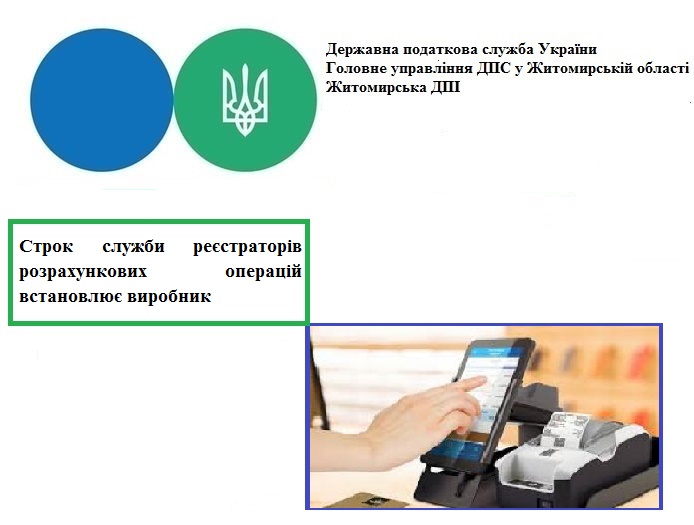 Житомирська ДПІ ГУ ДПС у Житомирській обалсті інформує, що відповідно до пункту 2 Порядку технічного обслуговування та ремонту реєстраторів розрахункових операцій, затверджено постановою Кабінету Міністрів України від 12 травня 2004 року № 601 (зі змінами і доповненнями), строк служби — строк, протягом якого виробник (постачальник) гарантує працездатність реєстратора розрахункових операцій, у тому числі комплектувальних виробів та його складових частин, збереження інформації у фіскальній пам’яті за умови дотримання користувачем вимог експлуатаційних документів.