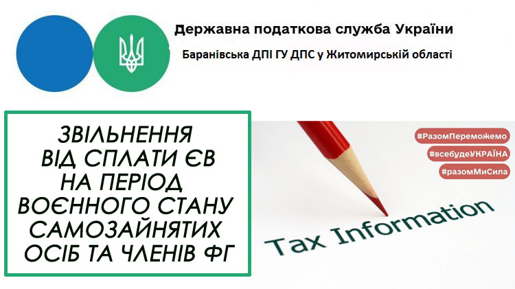 Баранівська ДПІ: Звільнення від сплати ЄВ на період воєнного стану самозайнятих осіб та членів ФГ