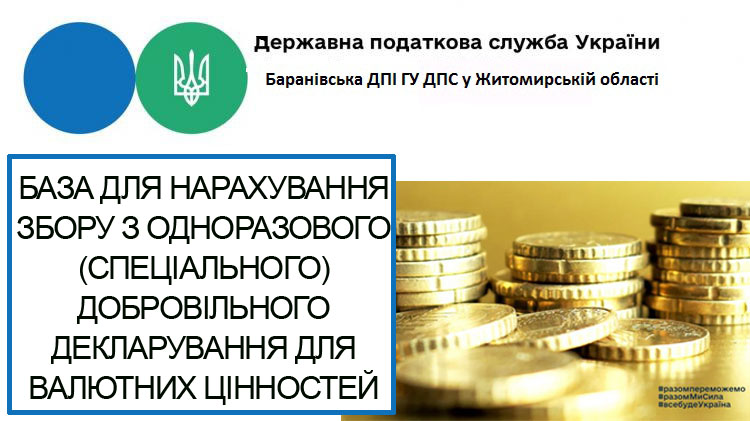 Баранівська ДПІ ГУ ДПС у Житомирській області повідомляє, що згідно з п. 7.1 підрозд. 9 прим. 4 розд. XX «Перехідні положення» Податкового кодексу України для об’єктів декларування, визначених підпунктом «а» п. 4 підрозд. 9 прим. 4 розд. XX «Перехідні положення» ПКУ базою для нарахування збору з одноразового (спеціального) добровільного декларування є грошова вартість відповідного об’єкта декларування або номінальна вартість грошової вимоги, у тому числі за позиками, наданими третім особам.