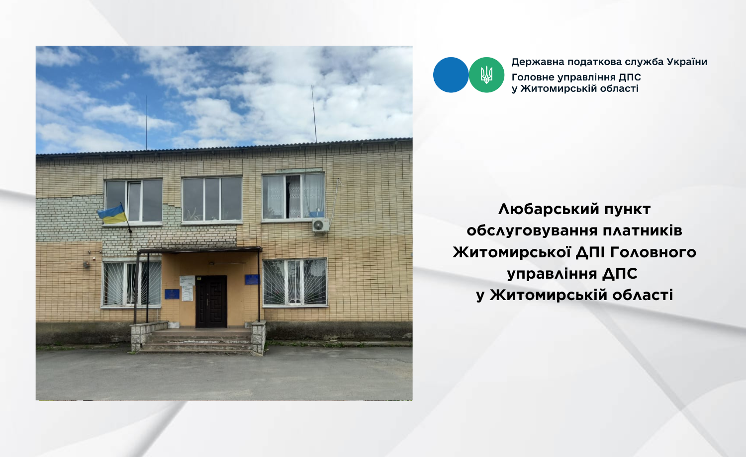 Житомирська ДПІ Головного управління ДПС у Житомирській області повідомляє, що Любарський пункт обслуговування платників Житомирської ДПІ, який знаходиться за адресою –