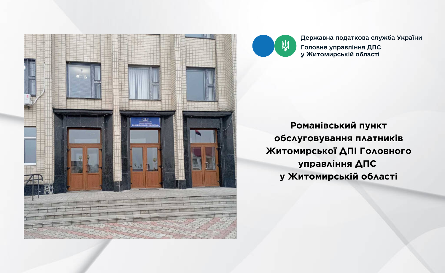 Житомирська ДПІ Головного управління ДПС у Житомирській області повідомляє, що Романівський пункт обслуговування платників Житомирської ДПІ Головного управління ДПС у Житомирській області тимчасово не працюватиме 25.11.2025 року; 01.12.2025 року.
