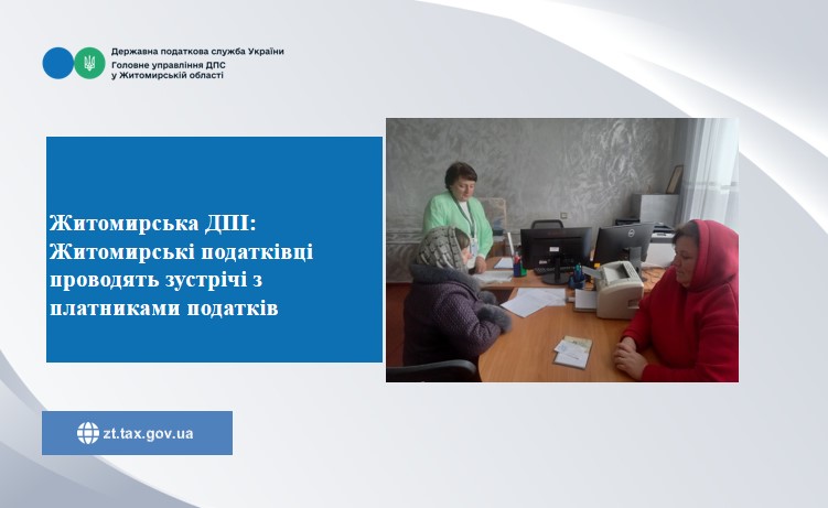 Під час чергової зустрічі з платниками податків податківець Житомирської ДПІ Головного управління ДПС в Житмирській області Прокопенко Валентина розповіла про порядок нарахування податку на нерухоме майно відмінне від земельної ділянки, земельного податку з фізичних та наголосила на важливості їх своєчасної сплати. Крім того, ознайомила присутніх з роботою «Електронного кабінету» та мобільного застосунку «Моя податкова», а також наголосила, що за допомогою цих сервісів авторизовані платники мають можливість переглянути сформовані податкові повідомлення-рішення щодо сум нарахованих їм податкових зобов’язань з плати за землю, податку на нерухоме майно, перевірити стан розрахунків з бюджетом та отримувати відомості про виплачені доходи.