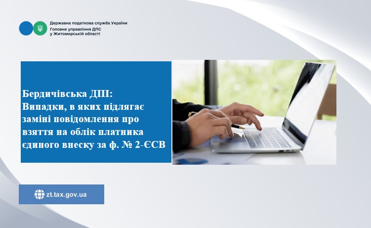 Бердичівська ДПІ інформує, що відповідно до п. 6 розд. ІІІ Порядку обліку платників єдиного внеску на загальнообов’язкове державне соціальне страхування, затвердженого наказом Міністерства фінансів України від 24.11.2014 №1162 із змінами та доповненнями (далі – Порядок №1162) у разі внесення змін до даних, що вказуються у повідомленні про взяття на облік платника єдиного внеску за формою №2-ЄСВ (далі – повідомлення за ф.2-ЄСВ), наведеною у додатку 3 до Порядку №1162 (найменування, прізвище, ім’я, по батькові, місцезнаходження, місце проживання платника єдиного внеску на загальнообов’язкове державне соціальне страхування (далі – єдиний внесок), контролюючого органу, в якому платник єдиного внеску перебуває на обліку тощо), повідомлення за ф. № 2-ЄСВ підлягає заміні у контролюючому органі.