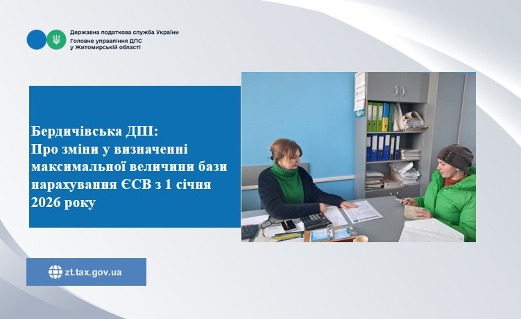 Фахівці Бердичівської ДПІ звертають увагу платників податків, що відповідно до Закону України від 03 грудня 2025 року № 4695-ІX «Про Державний бюджет України на 2026 рік» визначено розмір максимальної величини бази нарахування єдиного внеску, який з 01 січня 2026 року становить: