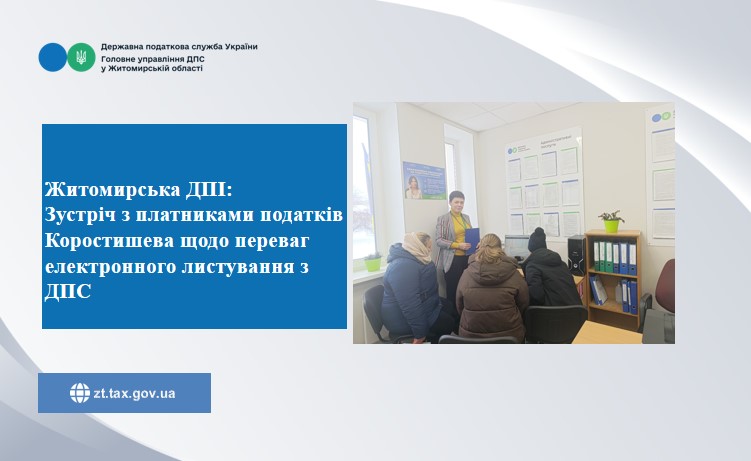 Фахівцем Коростишівського пункту обслуговування платників Житомирської ДПІ Головного управління ДПС у Житомирській області Нагаєвською Наталією проведено зустріч з платниками податків на якій проінформовано платників про спрощений механізм подання Заяви про бажання отримувати документ через Електронний кабінет та надано практичну допомогу з цього питання.