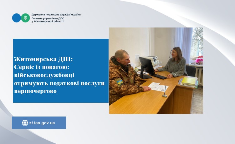 У Житомирській ДПІ ГУ ДПС у Житомирській області, у рамках Національної стратегії безбар’єрного простору та важливості створення рівних умов доступу до податкових послуг, першочергово та без зайвих очікувань обслуговуються військовослужбовці. Зважаючи на обмежений час, який мають захисники для вирішення адміністративних питань, метою податківців є надання якісних послуг максимально зручно та оперативно.
