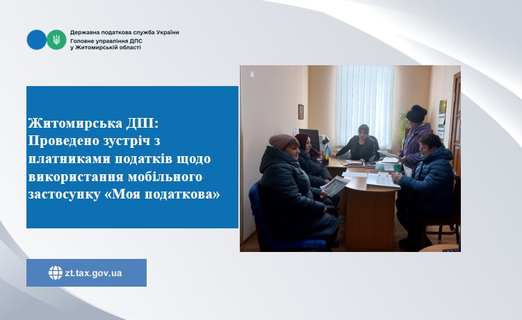 Днями, головний державний інспектор відділу ведення Державного реєстру фізичних осіб – платників податків Житомирської ДПІ ГУ ДПС у Житомирській області Тетяна Бортнічук провела робочу зустріч з платниками податків щодо використання мобільного застосунку «Моя податкова».