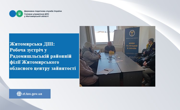 Головний державний інспектор Сергій Кисельчук Житомирської податкової інспекції ГУ ДПС у Житомирській області (Радомишльська точка доступу) провів зустріч у Радомишльській районній філії Житомирського обласного центру зайнятості.