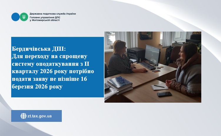 Працівники Бердичівської ДПІ нагадують підприємцям, що для переходу на спрощену систему оподаткування чи іншу групу платника єдиного податку з IІ кварталу 2026 року потрібно подати до ДПС заяву встановленої форми не пізніше 16 березня 2026 року.