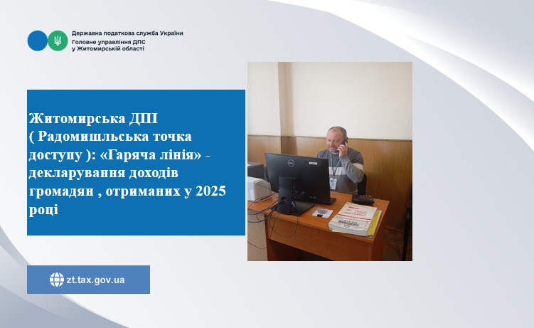 У Житомирській ДПІ ГУ ДПС в Житомирській області ( Радомишльська точка доступу ): відбувся сеанс телефонного зв’язку «гаряча лінія» на тему: «Особливості декларування доходів громадян, отриманих у 2025 році» за участю ГДІ Сергія Кисельчука.