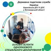 Працівниками ЦОП Баранівської ДПІ проводяться зустрічі з громадянами щодо роз'яснення законодавчих аспектів одноразового декларування.Так в ході зустрічі головним податковим ревізором Надією Вовк зазначено, що до 1 вересня 2022 року громадяни мають змогу задекларувати свої активи, які були одержані ними до 1 січня 2021 року, та з яких не були сплачені податки. Із задекларованих активів потрібно сплатити одноразовий обов’язковий збір, розмір якого визначає декларант самостійно шляхом застосування до бази оподаткування відповідних ставок. Термін сплати – протягом 30 календарних днів з дати подання декларації.