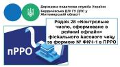 Отже, в рядку 28 фіскального касового чеку за ф. № ФКЧ-1 «Контрольне число, сформоване в режимі офлайн» відображається значення контрольного числа, що обчислюється автоматично самим ПРРО відповідно до механізму визначеному в Описі АРІ фіскального сервера та має вигляд «хекс» строки.