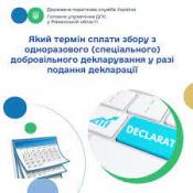Оврцька ДПІ Головного управління ДПС у Житомирській області нагадує, що сплата збору з одноразового (спеціального) добровільного декларування здійснюється декларантом протягом 30 календарних днів з дати подання одноразової (спеціальної) добровільної декларації.