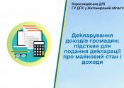 В Коростишівській ДПІ Головного управління ДПС у Житомирській області нагадують платникам податків, що відповідно до норм розділу IV Податкового кодексу обов’язок щодо подання декларації у платників податків виникає при отриманні: