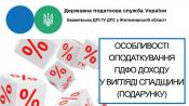 Баранівська ДПІ ГУ ДПС у Житомирській області звертає увагу платників податків, що відповідно до п. 174.6 ст. 174 Податкового кодексу України від 02 грудня 2010 року № 2755-VI із змінами та доповненнями (далі – ПКУ) об’єкти дарування, зазначені в п. 174.1 ст. 174 ПКУ, подаровані платнику податку іншою фізичною особою, оподатковуються згідно з правилами, встановленими розділом ІV ПКУ для оподаткування спадщини.