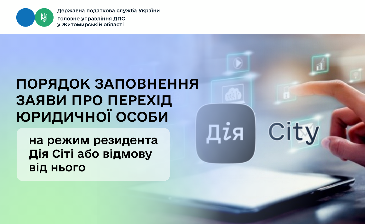 Головне управління ДПС у Житомирській області повідомляє, що відповідно до п. 141.10 ст. 141 Податкового кодексу України від 02 грудня 2010 року № 2755-VI (далі – ПКУ) для переходу на оподаткування як резидента Дія Сіті – платника податку на особливих умовах або відмови від такого оподаткування юридична особа подає до контролюючого органу за своєю податковою адресою відповідну заяву.