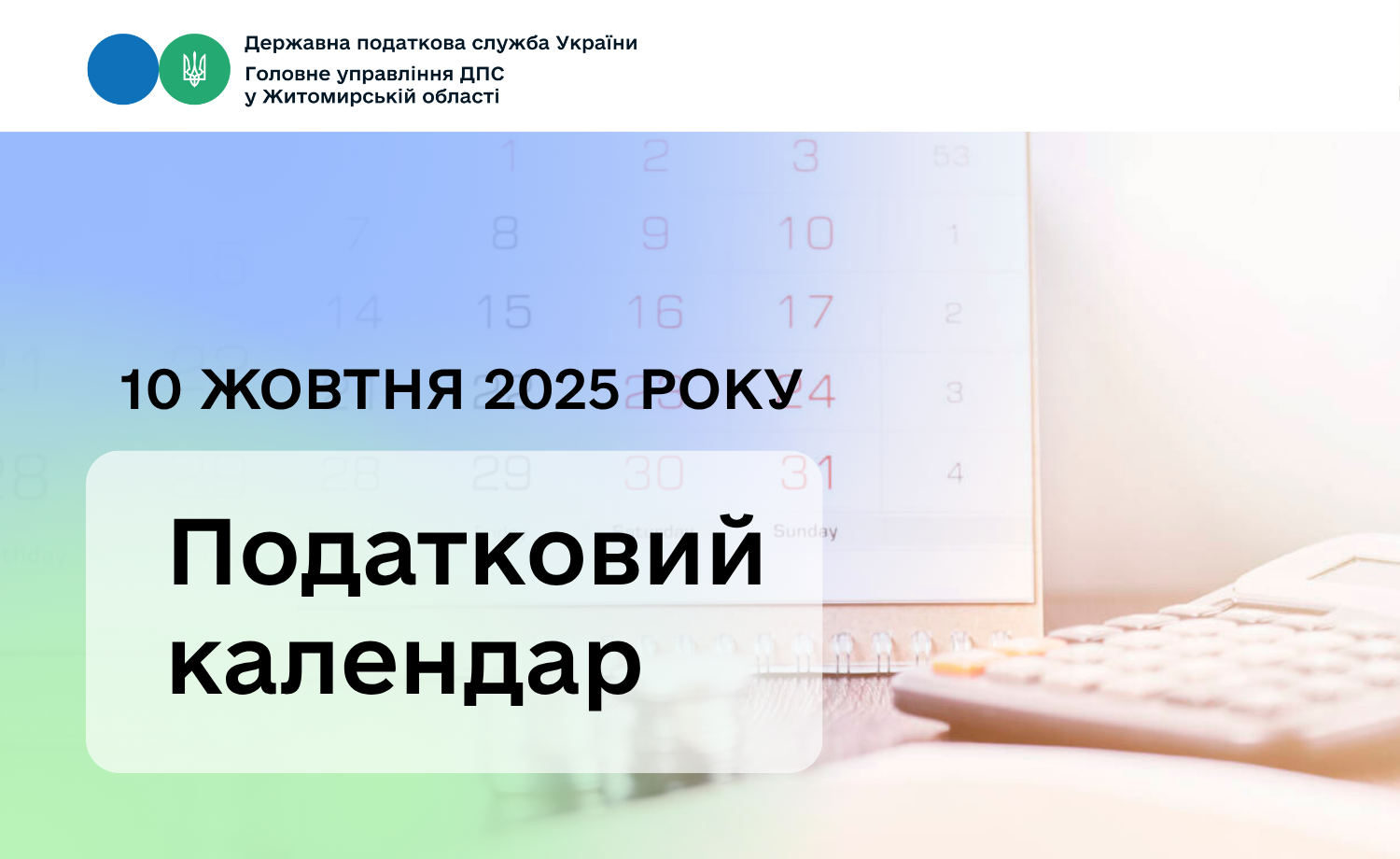 Головне управління ДПС у Житомирській області нагадує платникам податків, що 10 жовтня 2025 року, п’ятниця, останній день подання за вересень 2025 року: