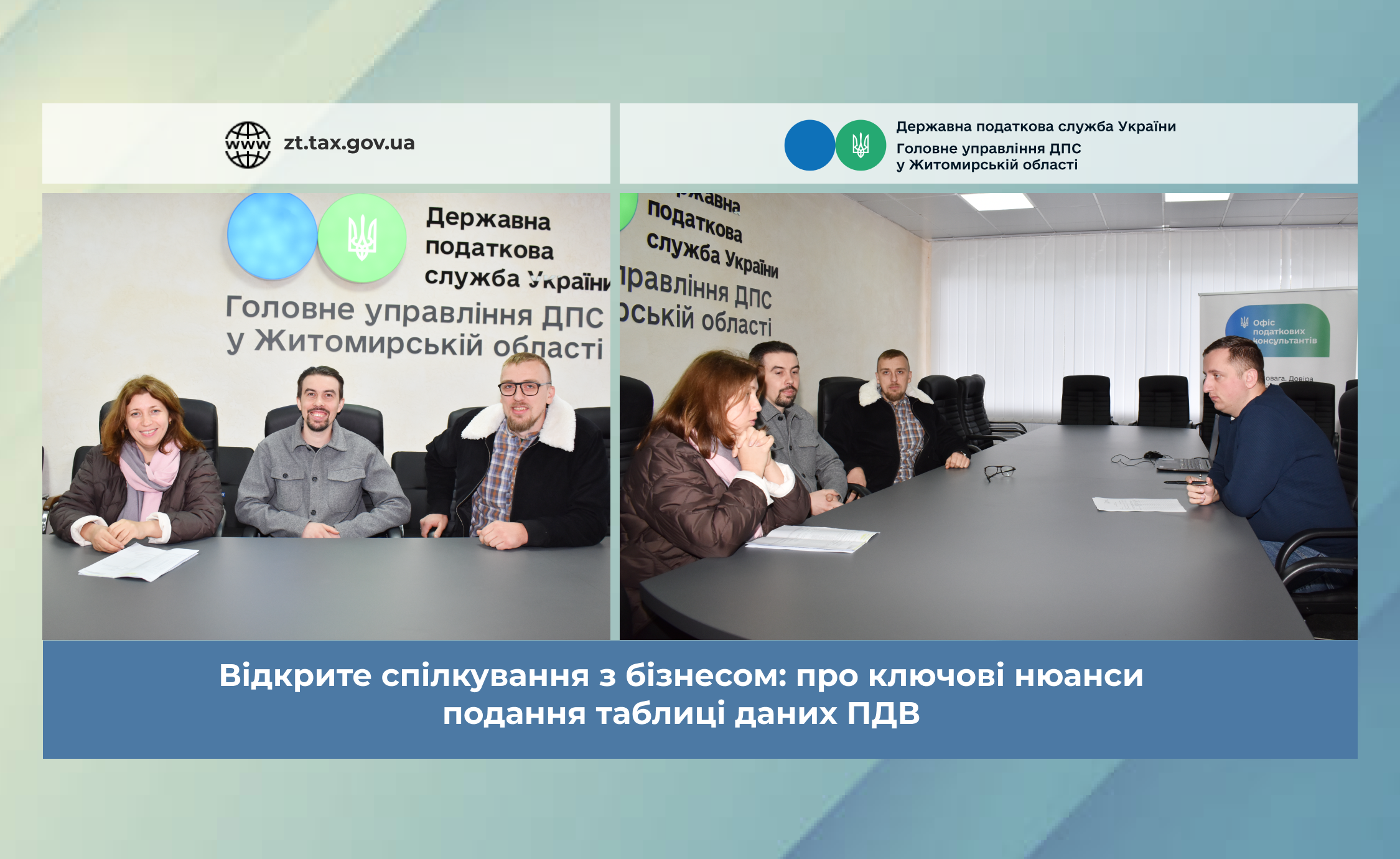 Головне управління ДПС у Житомирській області продовжує практику відкритого діалогу з платниками податків у форматі консультаційних зустрічей. Такі заходи спрямовані на підтримку суб’єктів господарювання, зокрема з питань зупинення реєстрації податкових накладних та розрахунків коригування в ЄРПН.