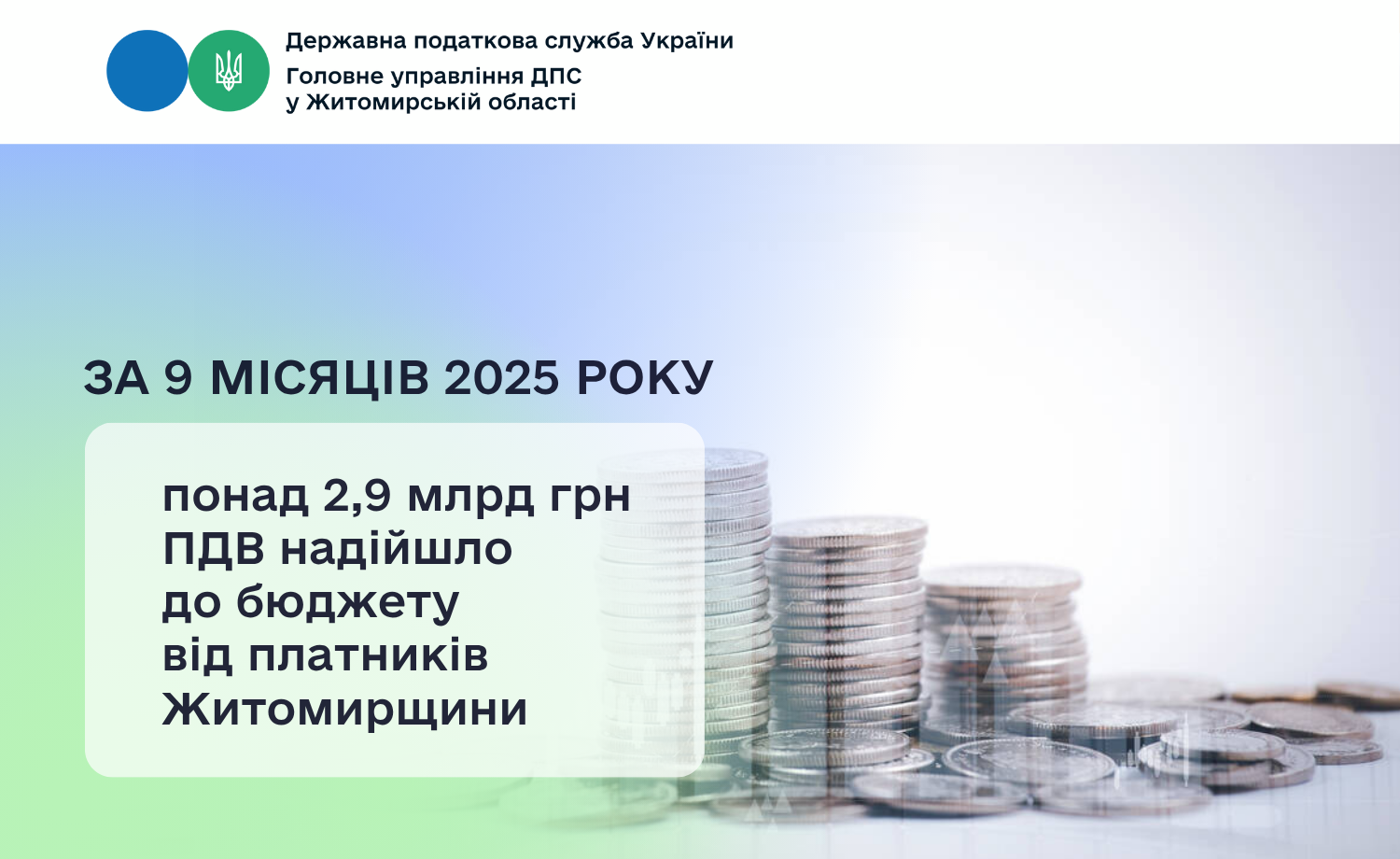 Понад 2,9 млрд гривень ПДВ надійшло до бюджету від платників Житомирщини