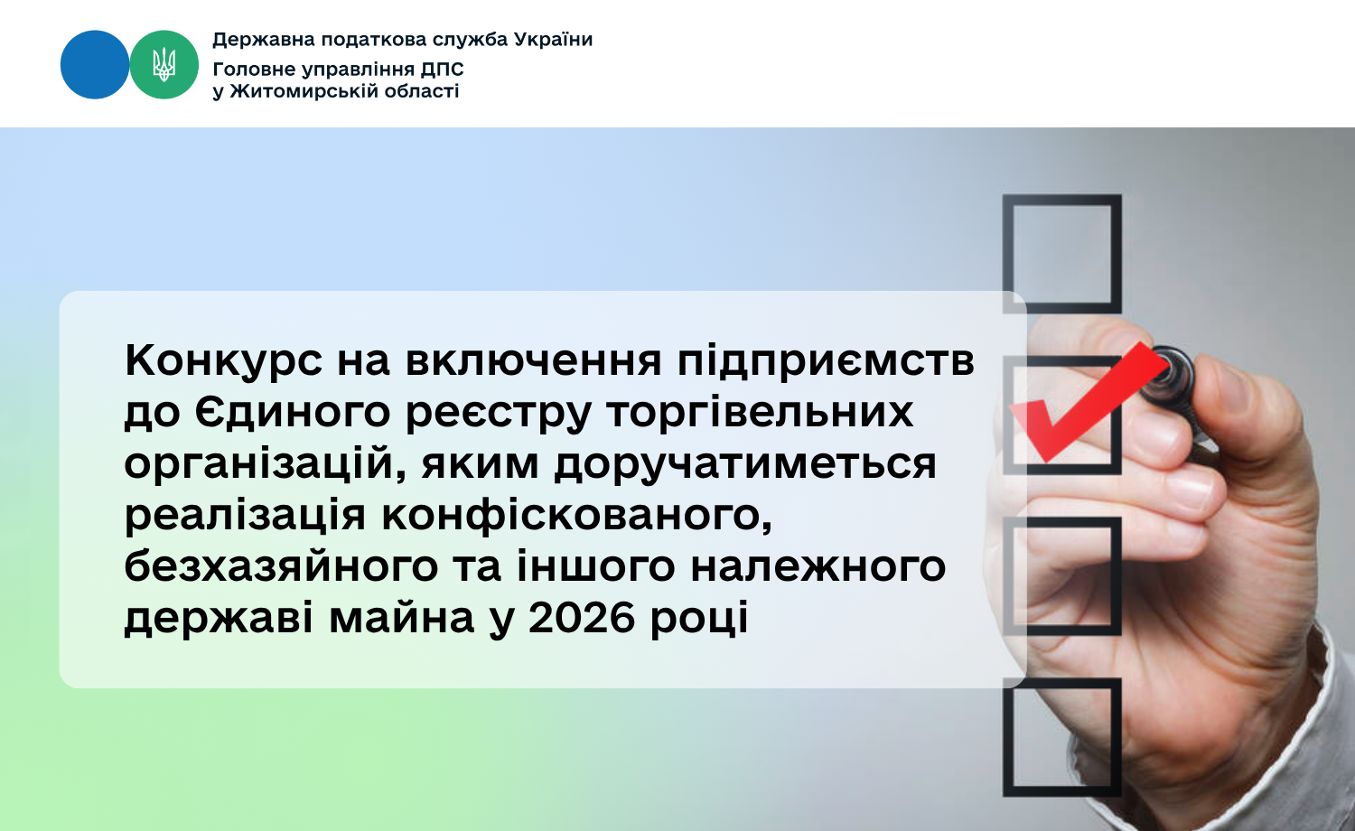 Головним управлінням ДПС у Житомирській області оголошено конкурс на включення підприємств до Єдиного реєстру торгівельних організацій, яким доручатиметься реалізація конфіскованого, безхазяйного та іншого належного державі майна у 2026 році.
