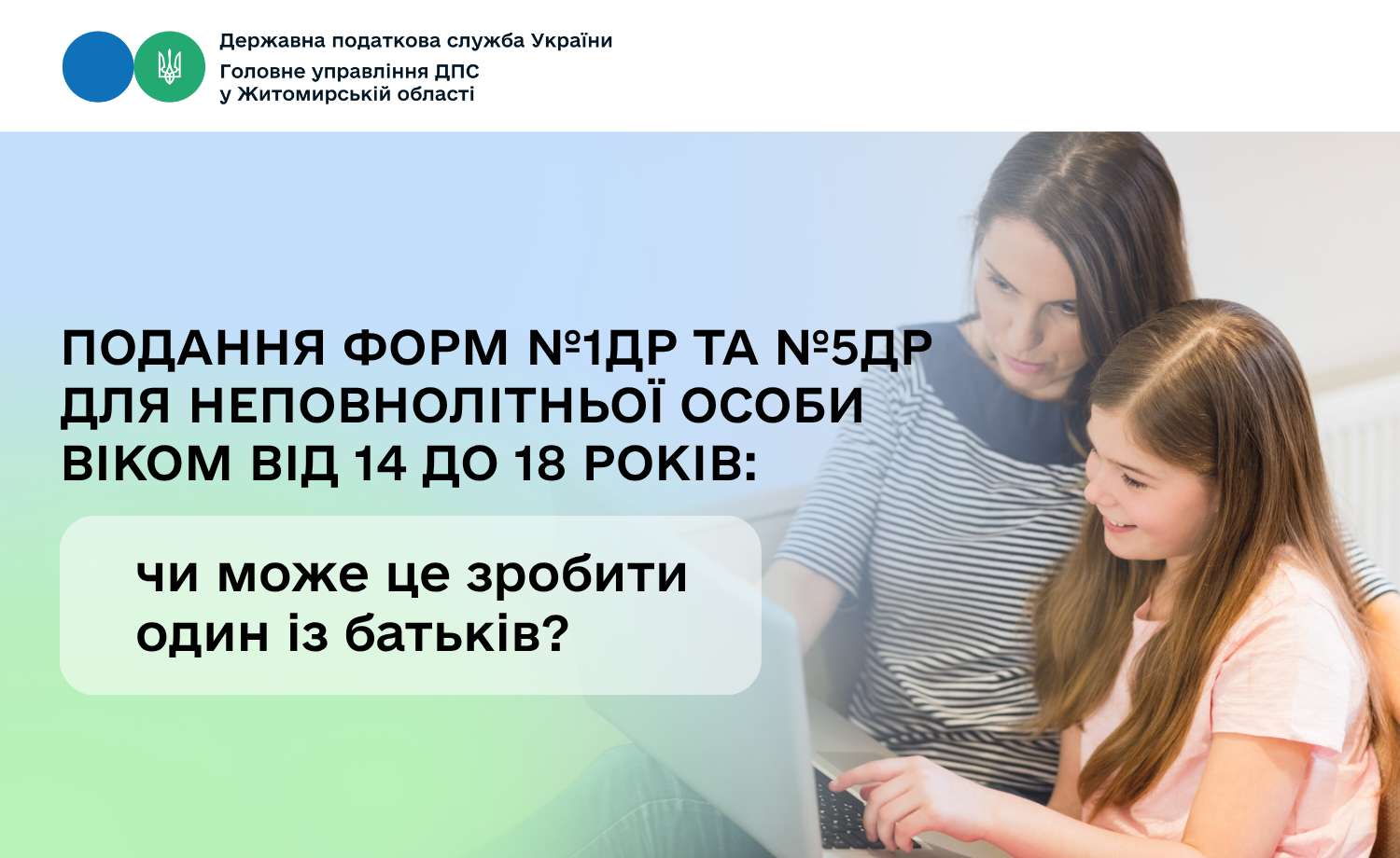 Один із батьків може подати через Електронний кабінет Облікову картку за ф. № 1ДР / Заяву за ф. № 5ДР неповнолітньої особи віком від 14 до 18 років та додати документи, необхідні для реєстрації / внесення змін до Державного реєстру, зокрема документ, що посвідчує особу одного із батьків, та паспорт громадянина України неповнолітньої особи.