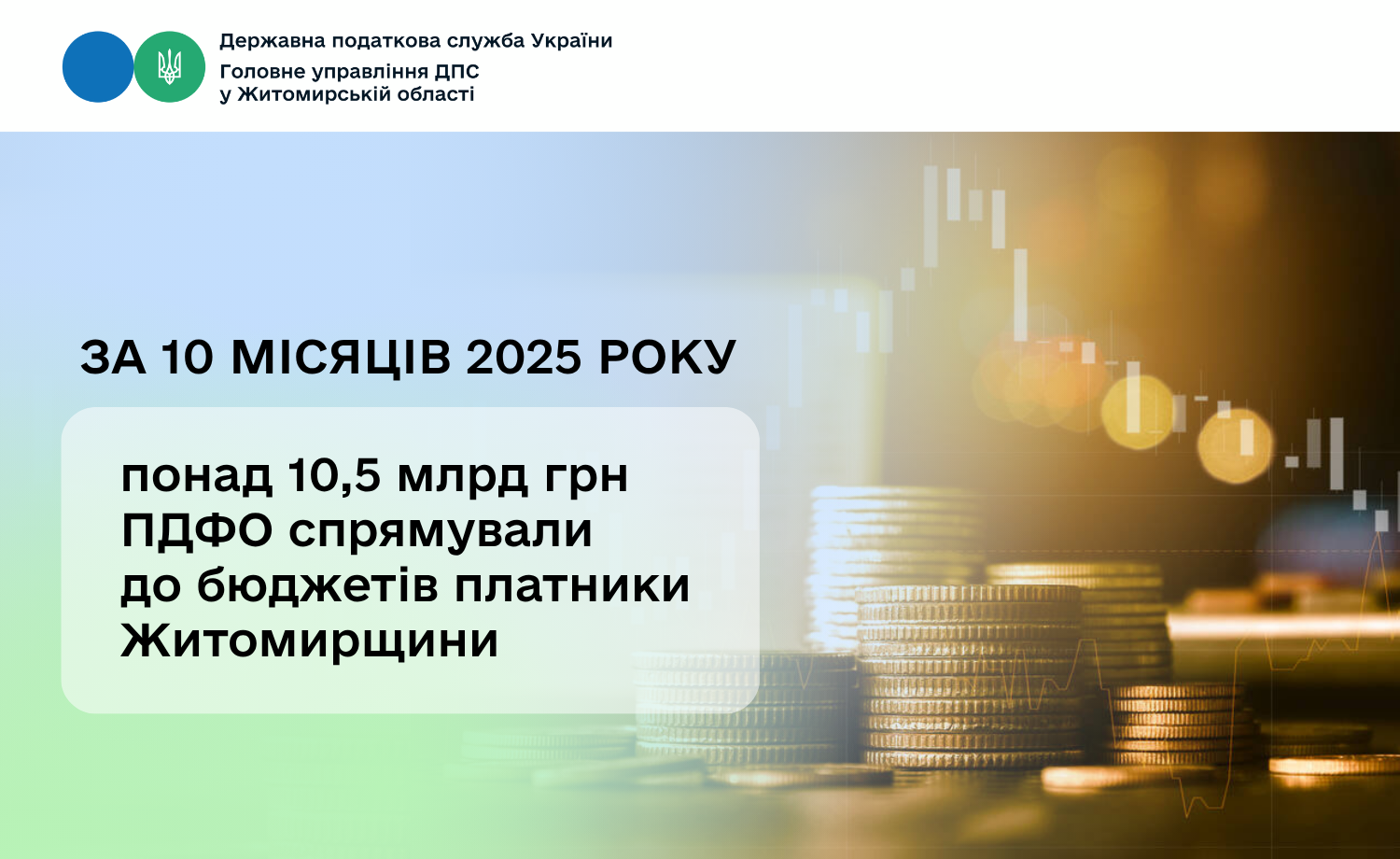 За десять місяців платники спрямували до бюджетів усіх рівнів 10 мільярдів 559,8 мільйонів гривень податку на доходи фізичних осіб. Як зазначив в.о. начальника Головного управління ДПС у Житомирській області Олександр М’ясковський, рівень минулорічної сплати перевищено на 1 мільярд 722,7 мільйонів  гривень.