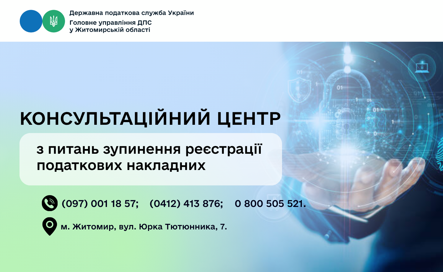Головне управління ДПС у Житомирській області інформує, що з метою покращення обізнаності платників податку щодо причин зупинення реєстрації податкової накладної / розрахунку коригування в Єдиному реєстрі податкових накладних, подання таблиці даних платника податку на додану вартість, відповідності/невідповідності платника податку на додану вартість критеріям ризиковості платника податку, роз’яснення алгоритму роботи СМ КОР працює консультаційний центр з надання інформаційної підтримки кожному платнику податків.