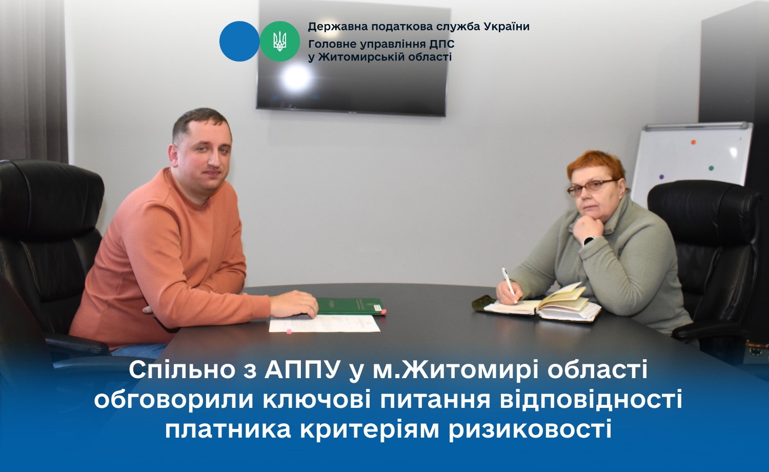 У рамках конструктивного діалогу в Головному управлінні ДПС у Житомирській області відбулася робоча зустріч в. о. заступника начальника управління з питань виявлення та опрацювання податкових ризиків Сергія Мелешка з керівником міського відділення Всеукраїнської громадської організації «Асоціація платників податків України» у м. Житомирі Олени Астахової, під час якої сторони обговорили актуальні питання, що стосуються ризиковості платників, визначили існуючі проблемні моменти та напрацювали шляхи їх вирішення.