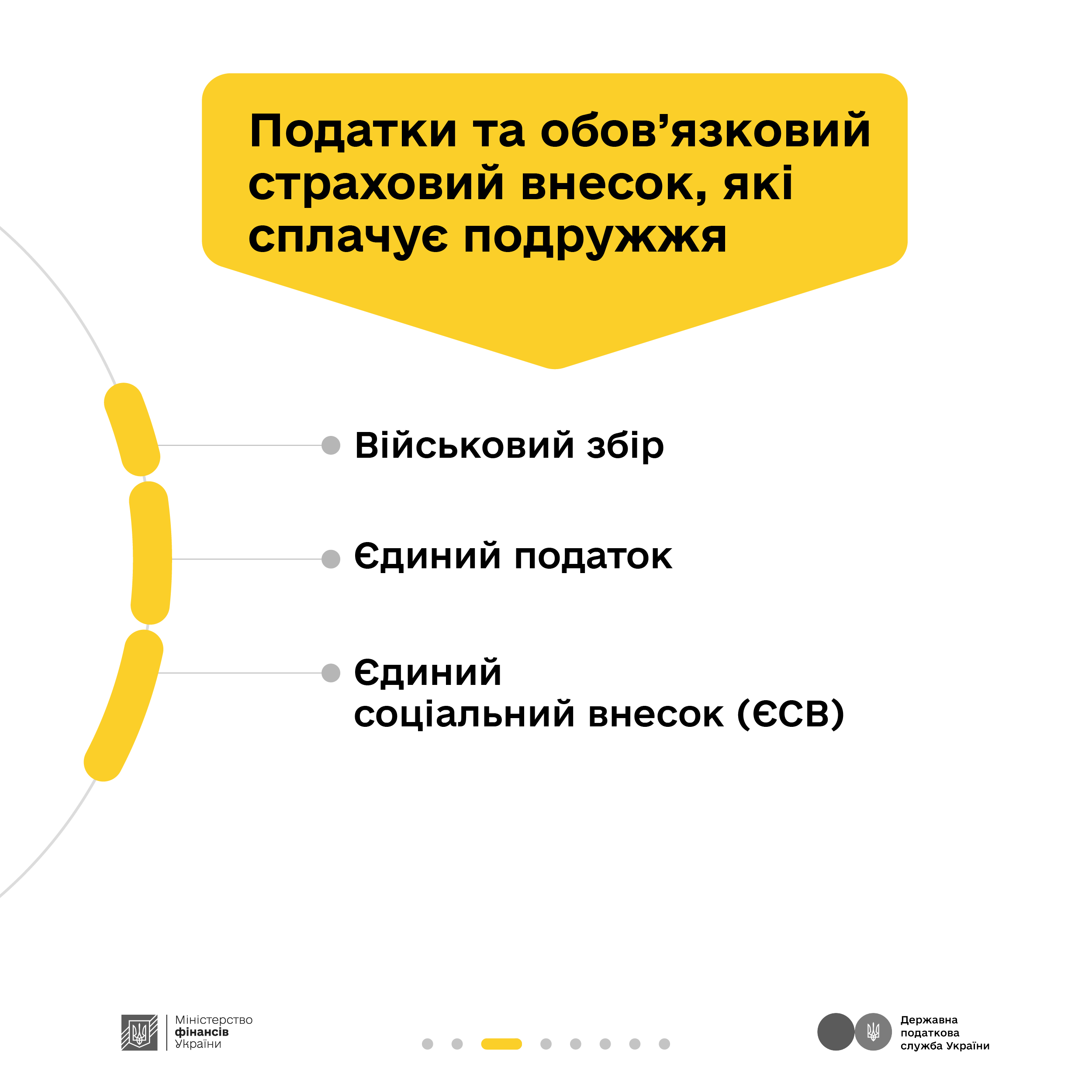 Раз на рік подружжя подає податкову декларацію через Електронний кабінет платника податків на сайті ДПС. Також щомісяця вони сплачують військовий збір, єдиний податок та кожного кварталу єдиний соціальний внесок.