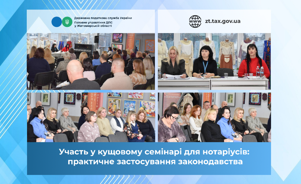 Сьогодні представники Головного управління ДПС у Житомирській області взяли участь у кущовому семінарі для нотаріусів, який відбувся з метою обговорення проблемних питань нотаріальної діяльності, пошуку шляхів їх вирішення, одержання максимальної інформації та обміну досвідом.