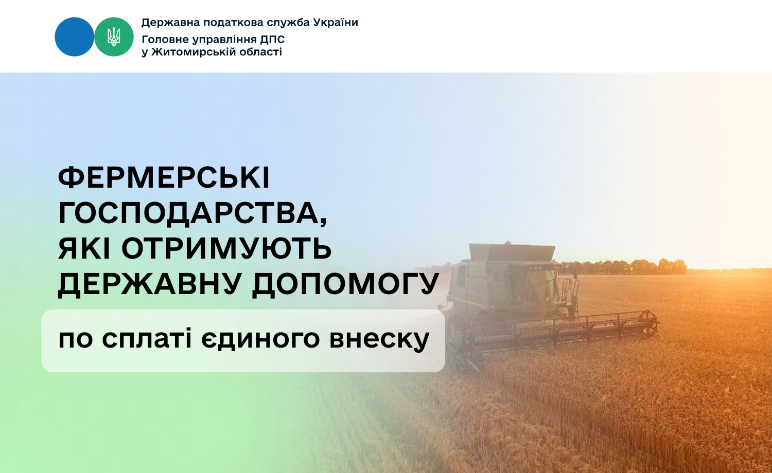 Головне управління ДПС у Житомирській області повідомляє, що відповідно до п. 13 прим. 1.1 ст. 13 прим. 1 Закону України від 26 червня 2004 року № 1877-ІV «Про засади державної аграрної політики та державної політики сільського розвитку» сімейним фермерським господарствам, які зареєстровані платниками єдиного податку четвертої групи згідно із главою 1 розд. XIV Податкового кодексу України від 02 грудня 2010 року № 2755-VI, надається додаткова фінансова підтримка через механізм доплати на користь застрахованих осіб – членів / голови сімейного фермерського господарства єдиного внеску на загальнообов’язкове державне соціальне страхування (далі – єдиний внесок) у сумі: